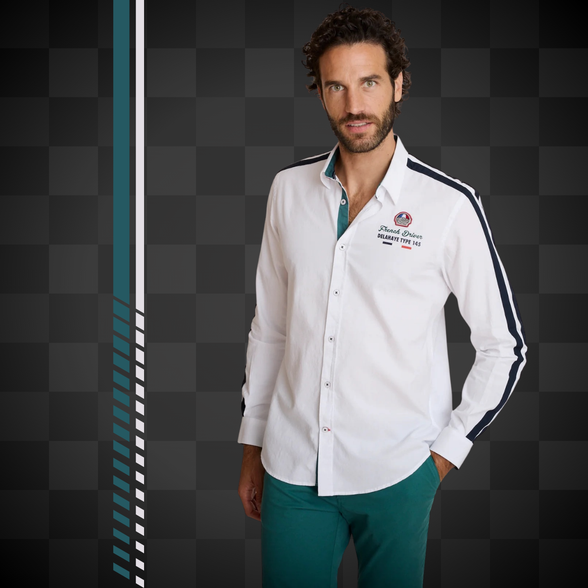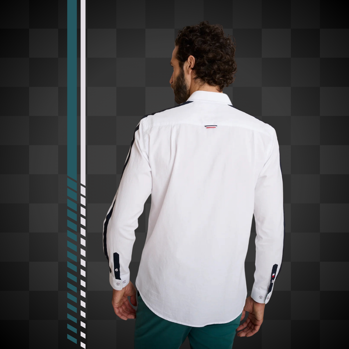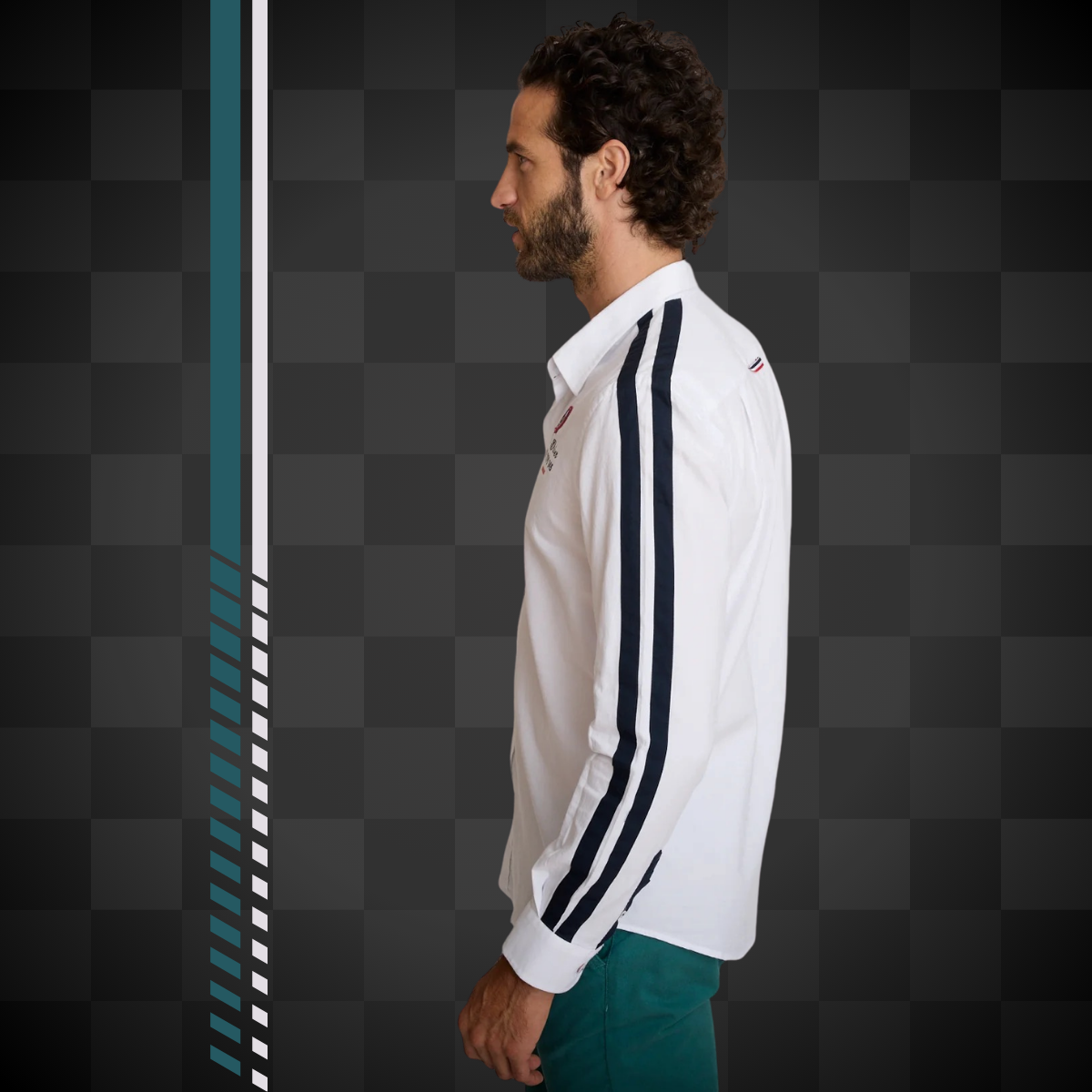 Chemise blanche homme coupe regular inspirée de l'univers racing. Bandes contrastées aux manches, broderie racing sur la poitrine et finitions soignées pour une allure sport chic affirmée.